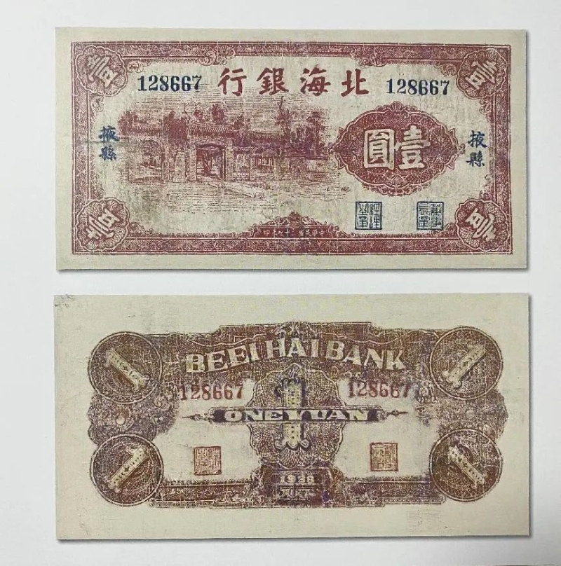 背景:“七七事变”之后,在中国共产党的影响和号召下,全国掀起了轰轰烈烈的抗日救亡运动,抗日战争全面爆发。在山东省胶东区域的版图上,多地成立了共产党的组织,在共产党领导下,建立起了抗日武装,进行了积极的抗日活动。其中活跃着两支比较大的抗日武装:一是在胶东东部山区的文登县(今文登市),中共胶东特委于1937年12月24日创建的山东人民抗日救国军第三军(以下简称三军),是我党领导下的胶东第一支人民抗日武装,该部发动了天福山起义,在牟平雷神庙打响了胶东抗日第一枪。二是在胶东西部莱州湾畔的掖县(今莱州市),中共掖县县委发动了玉皇顶起义,推翻伪政权,解放掖县城,1938年3月9日建立山东第一个县级抗日民主政府,并成立了山东最大的抗日武装——胶东抗日游击队第三支队(以下简称三支队)。三支队坚持一手抓枪杆子,一手抓钱袋子,4月份发起筹建“北海银行”,聘请原青岛中鲁银行总经理张玉田任行长。胶东特委和三军为了摆脱困境,制定了“西进抗日”的策略,于8月12日与三支队合编,取消三支队、保留三军番号。同时三支队所属的军需部门、北海银行、报社全部移交给了三军。这时的根据地以掖县为中心,蓬(莱)、黄(县)、掖(县)三县根据地连成一片。期间宣布北海银行正式成立,仍由张玉田负责,继续发行北海币,同时开办了存款、放款等业务。拟在黄县、蓬莱设分行,黄县开始着手筹建、蓬莱因顽匪蔡晋康的进攻而搁浅。9月18日三军又改编为八路军山东人民抗日游击第五支队(同年12月27日又改称八路军山东纵队第五支队,以下简称五支队)。在部队合编前后皆有战事,加之部队整编繁杂,直到12月1日,环境稳定之后,北海银行才在掖县县政府门前举行了盛大的开业典礼,以扩大社会影响。因日伪顽军的进攻,掖县、黄县、蓬莱相继失陷,胶东特委党政军分两部分转移到大泽山和艾崮山周围山区坚持抗战。1939年3月,北海银行在蓬莱草甸村(今草店村)疏散人员、停止营业,张玉田被介绍到赵保原那里去了(陈文其回忆录)。根据中共中央和山东分局的指示,1939年8月1日北海银行又恢复营业,由陈文其负责联系张玉田取回票版、账簿等物品,继续沿用创建时期的票版印发北海币,在“东、西、南、北”四个海区内流通。1941年7月反投降斗争取得重大胜利,八路军占领牙山,胶东抗日根据地东、西连成一片,北海币在整个胶东根据地范围内流通。初期,胶东北海银行称总行,下设鲁中、清河两分行。1940年秋北海银行总行移至鲁中,成立了山东省北海银行总行,胶东北海银行改称分行。1948年12月1日北海银行与华北银行、西北农民银行合并成立中国人民银行。
