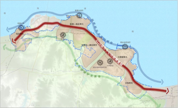 在功能布局上,烟台黄渤海新区将构建形成“一轴两带五单元”的总体布局。一轴即G228城市中心功能聚集轴,沿G228构建由城市道路和轨道交通组成的复合通道,沿线串联新区主要公共服务中心,打造新区功能提升的核心支撑空间;两带即滨海旅游休闲发展带和山体生态保护发展带;五单元即按照服务规模20—40平方公里、服务半径5公里,构建五个产城融合单元,单元内布局若干产业基地,配套公共服务设施和居住生活区,实现“产业龙头+主导产业链+创新中心+产业资本+公共服务平台+邻里中心”六位一体。