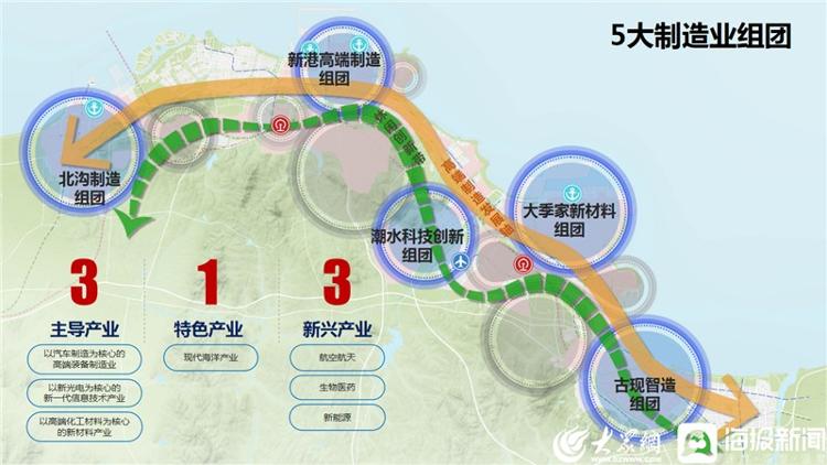 注重动能转换,完善港产融合的产业布局。依托新区产业基础和交通优势,强化制造业支撑地位,结合港口功能调整,布局“北沟、新港、潮水、大季家、古现”五大制造业组团,发展“3大主导产业+1个特色产业+3大新兴产业”的先进制造业体系。围绕蓬莱机场、高铁西站、蓬莱高铁站等重大交通枢纽,建设“蓬莱新城、八角湾新城”两大中心功能区,重点发展科技创新、教育研发、国际交往、商贸物流等现代服务功能。结合文旅农业资源,布局“南王山谷绿色经济、北沟现代农业”等特色组团,重点发展以葡萄酒、创意农业为主的现代化农业。